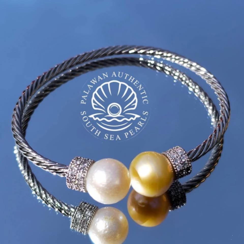 10.4 to 11mm Palawan Authentic White and Champagne Color South Sea Pearl Bangle in 5 Micron Plated Settings