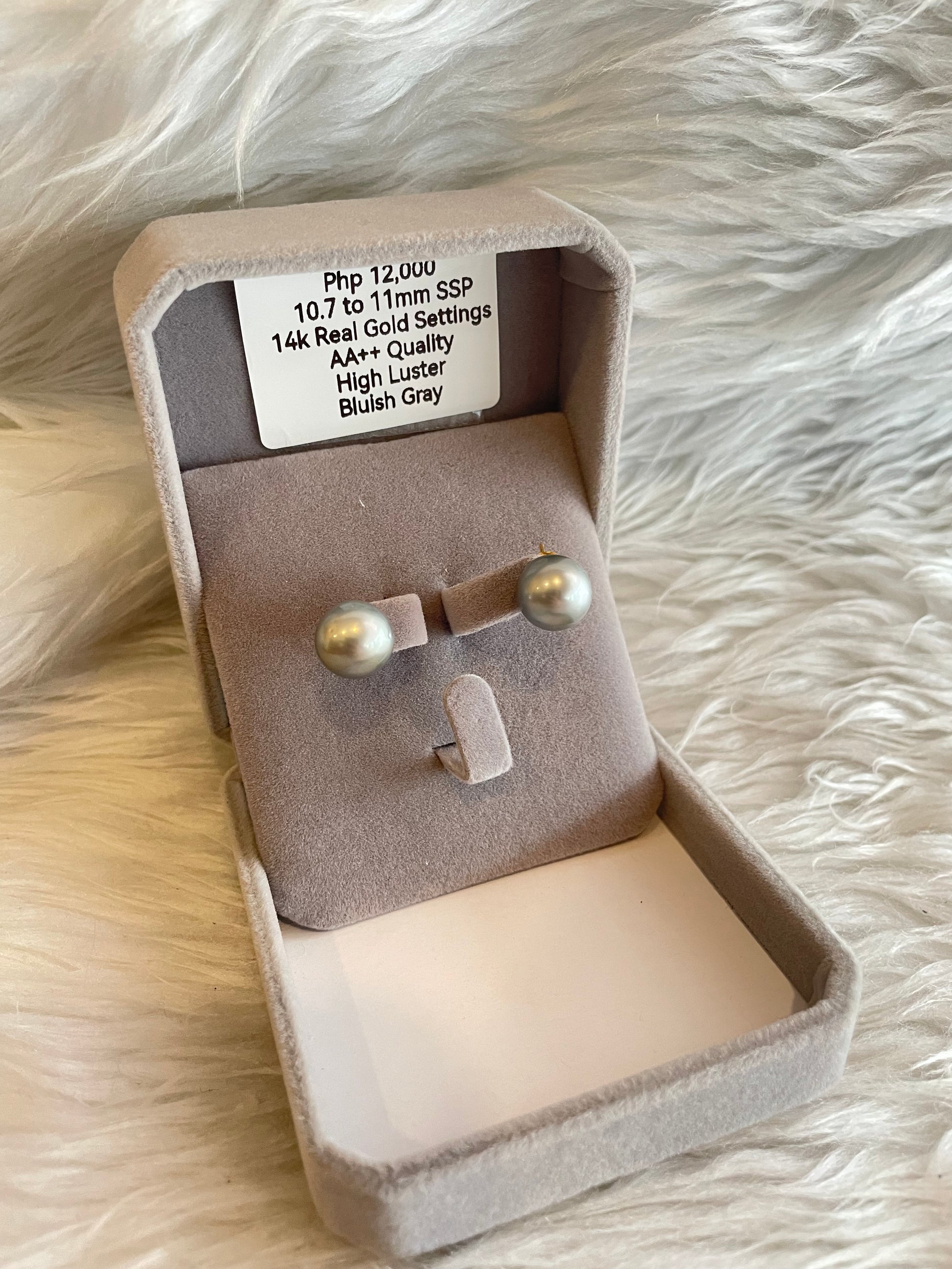 10.7mm to 11mm Authentic Bluish Gray Color South Sea Pearl Earrings in 14k Real Gold Settings