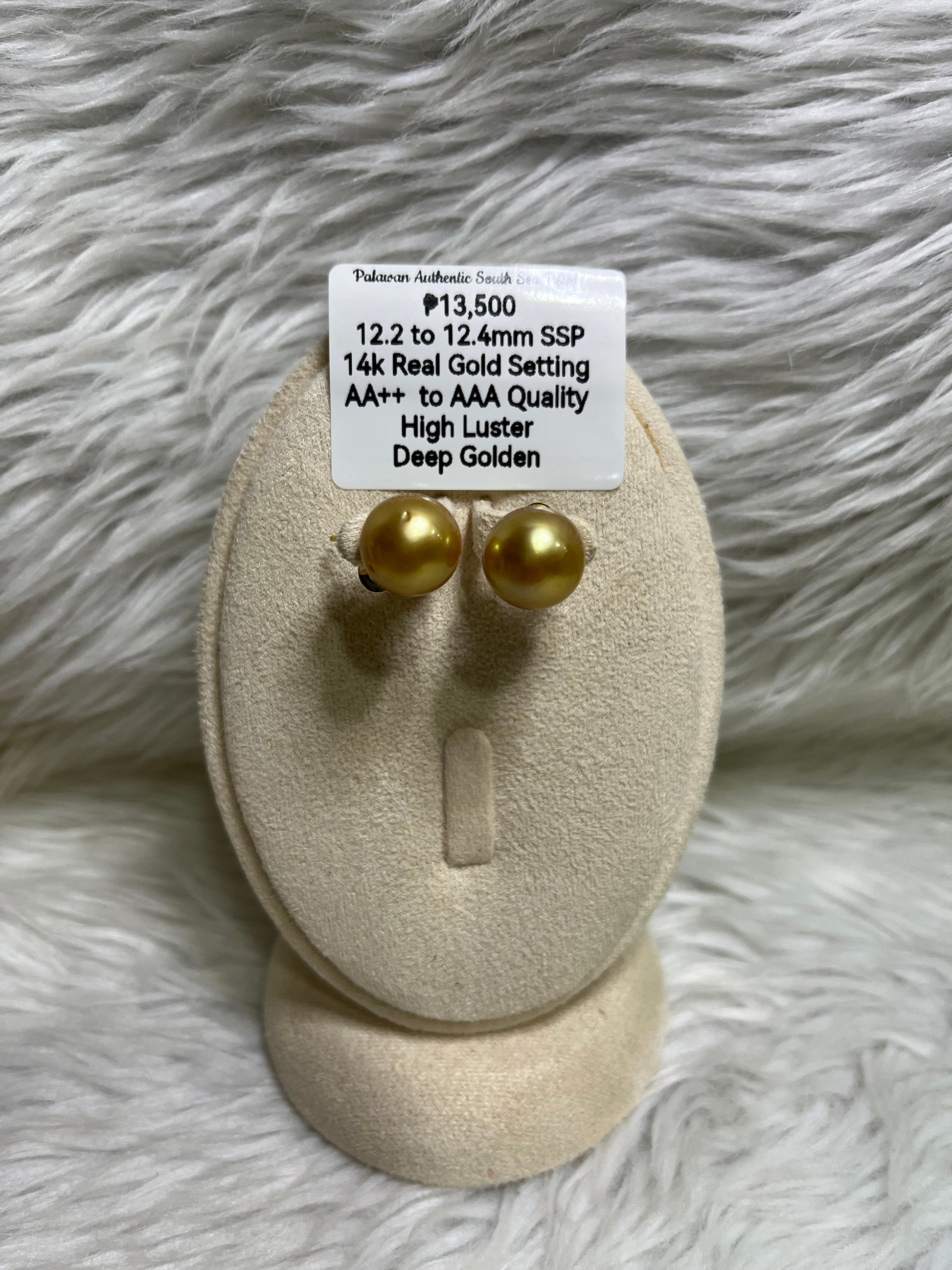 New Arrival! 12.2mm to 12.4mm Authentic Deep Golden South Sea Pearl Earrings in 14k Real Gold Settings
