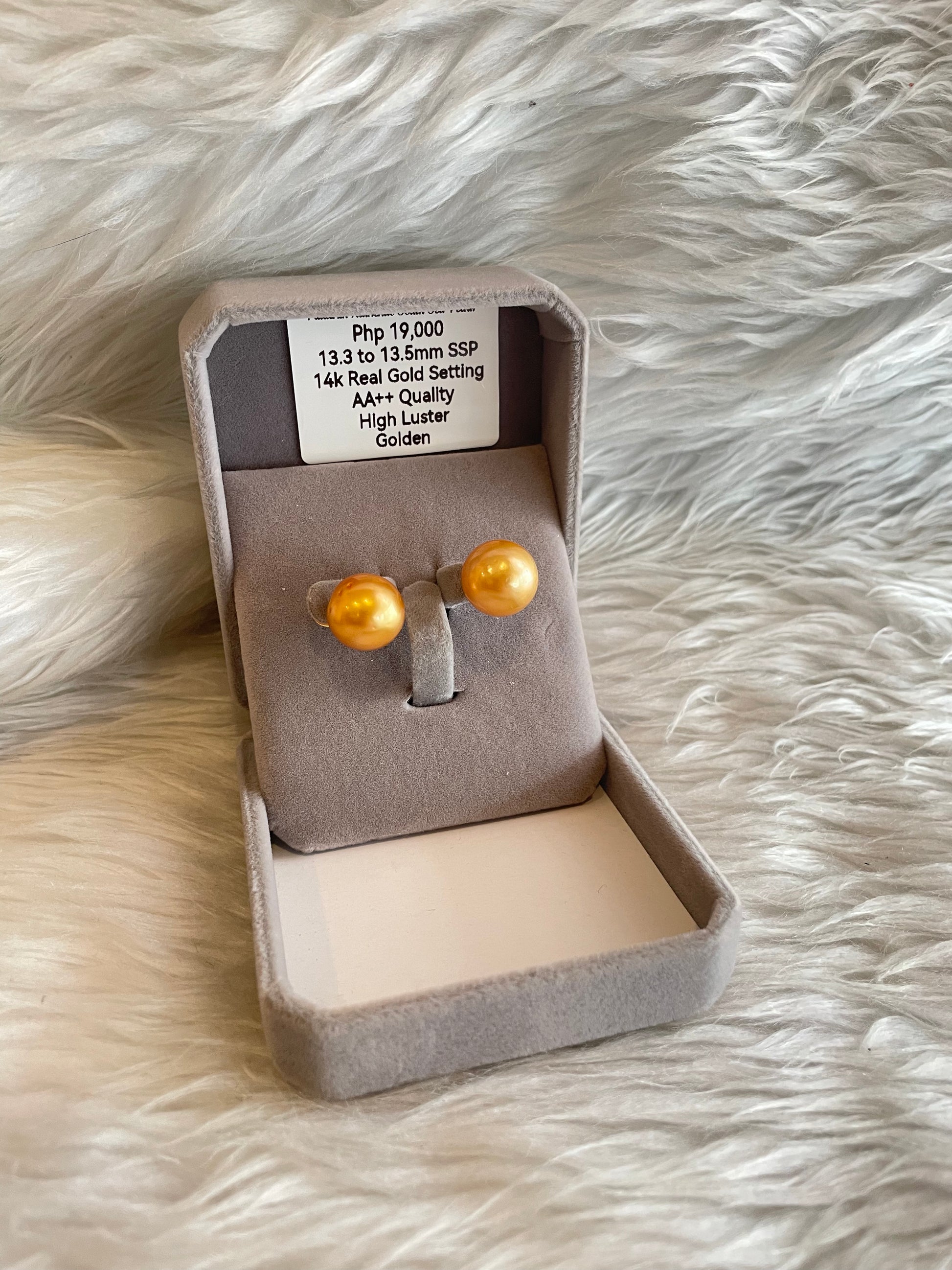13.3mm to 13.5mm Authentic Golden South Sea Pearl Earrings in 14k Real Gold Settings