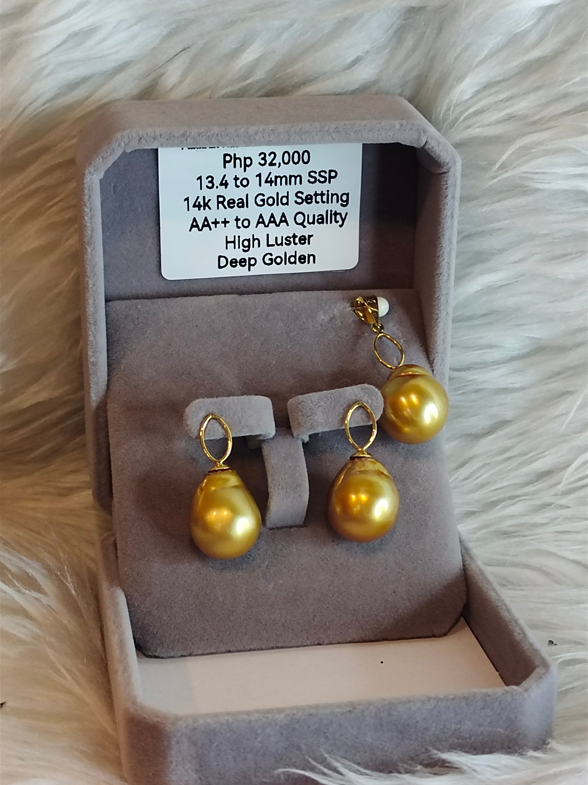 13.4mm to 14mm Authentic Deep Golden Color South Sea Pearl Sets in 14k Real Gold Settings