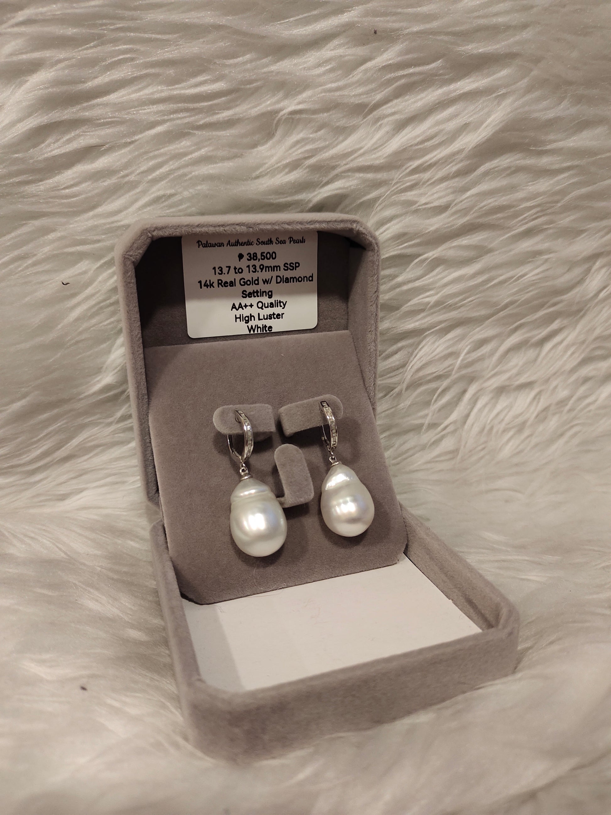 13.7mm to 13.9mm Authentic White South Sea Pearl in 14k Real Gold with Diamond Settings