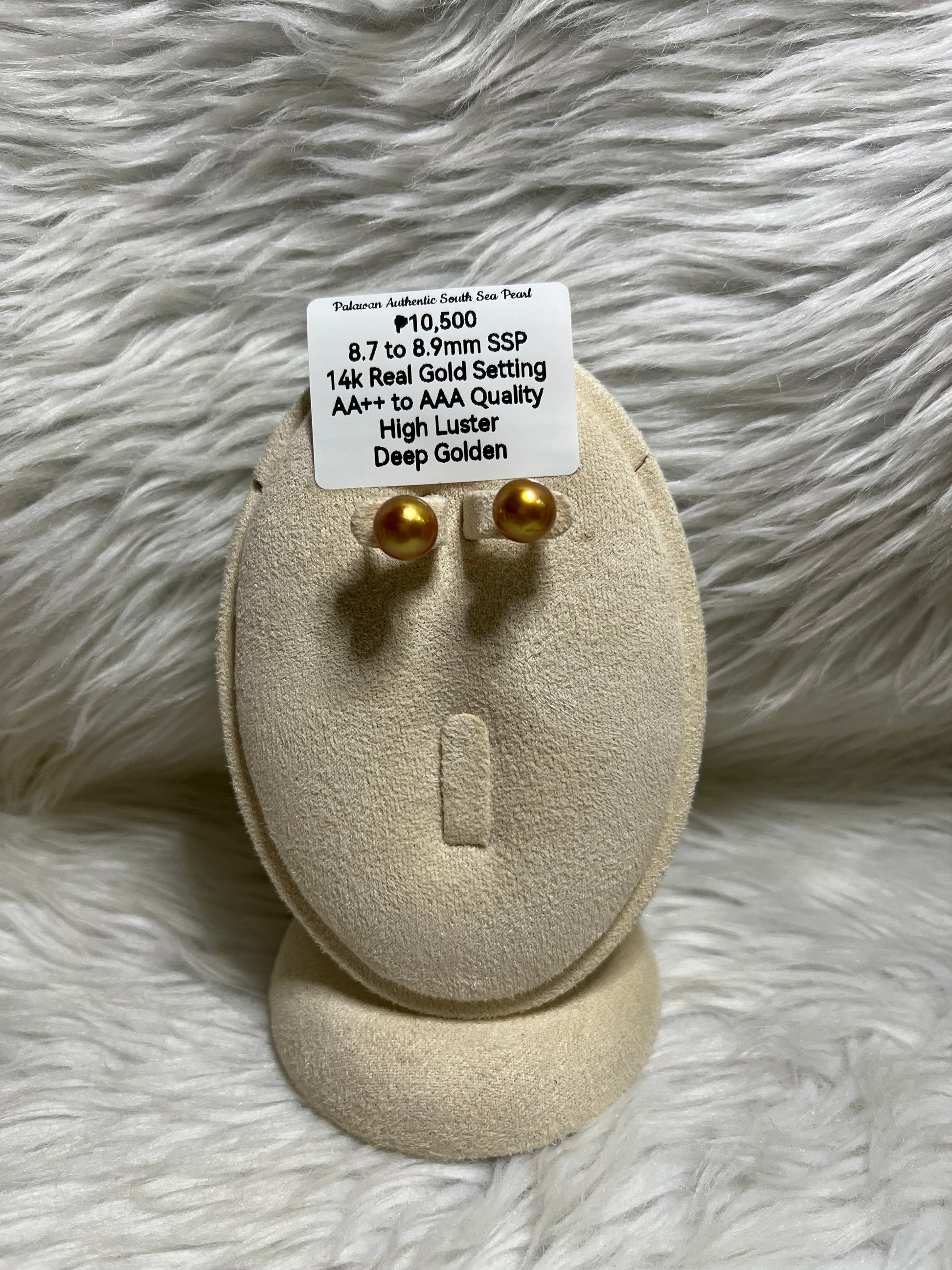 New Arrival! 8.7mm to 8.9mm Authentic Deep Golden South Sea Pearl Earrings in 14k Real Gold Settings