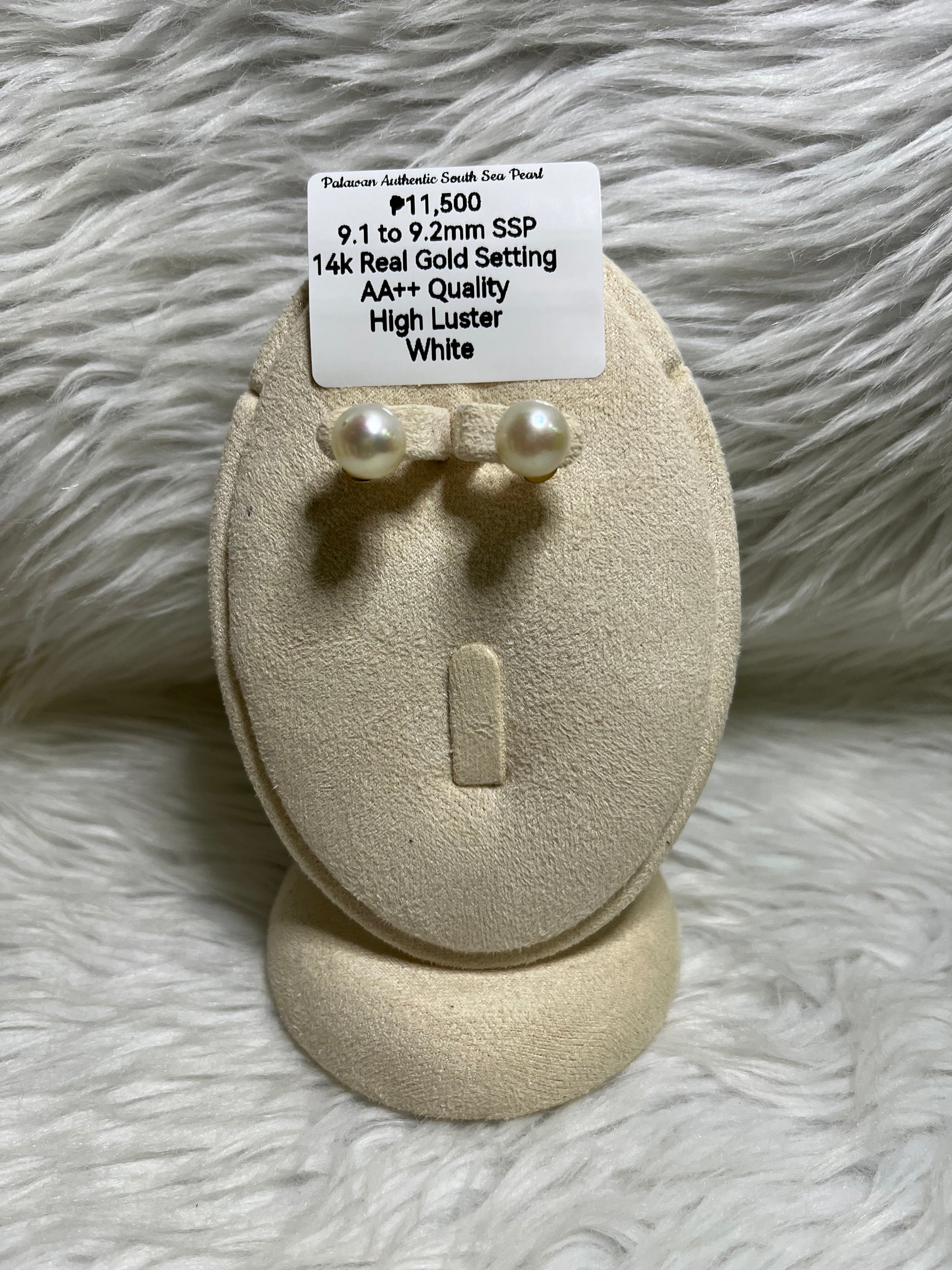 New Arrival! 9.1mm to 9.2mm Authentic White South Sea Pearl Earrings in 14k Real Gold Settings
