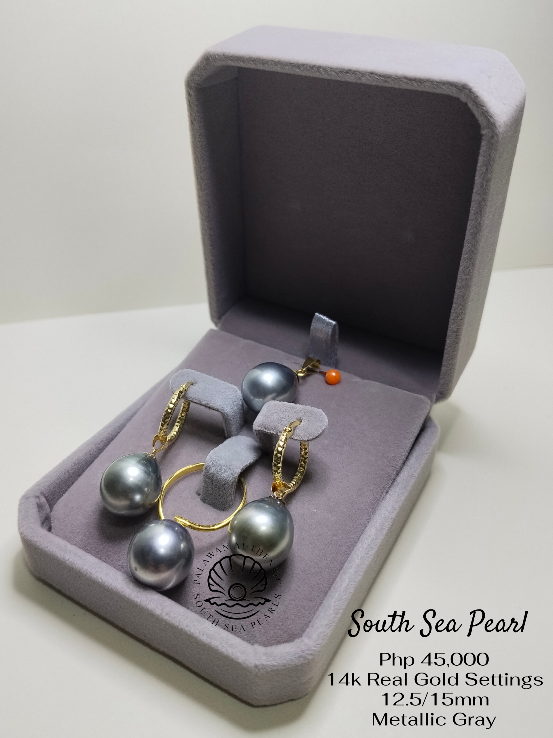 New Arrival! 12.5/15mm Palawan Authentic Metallic Gray South Sea Pearl Sets in 14k Real Gold Settings