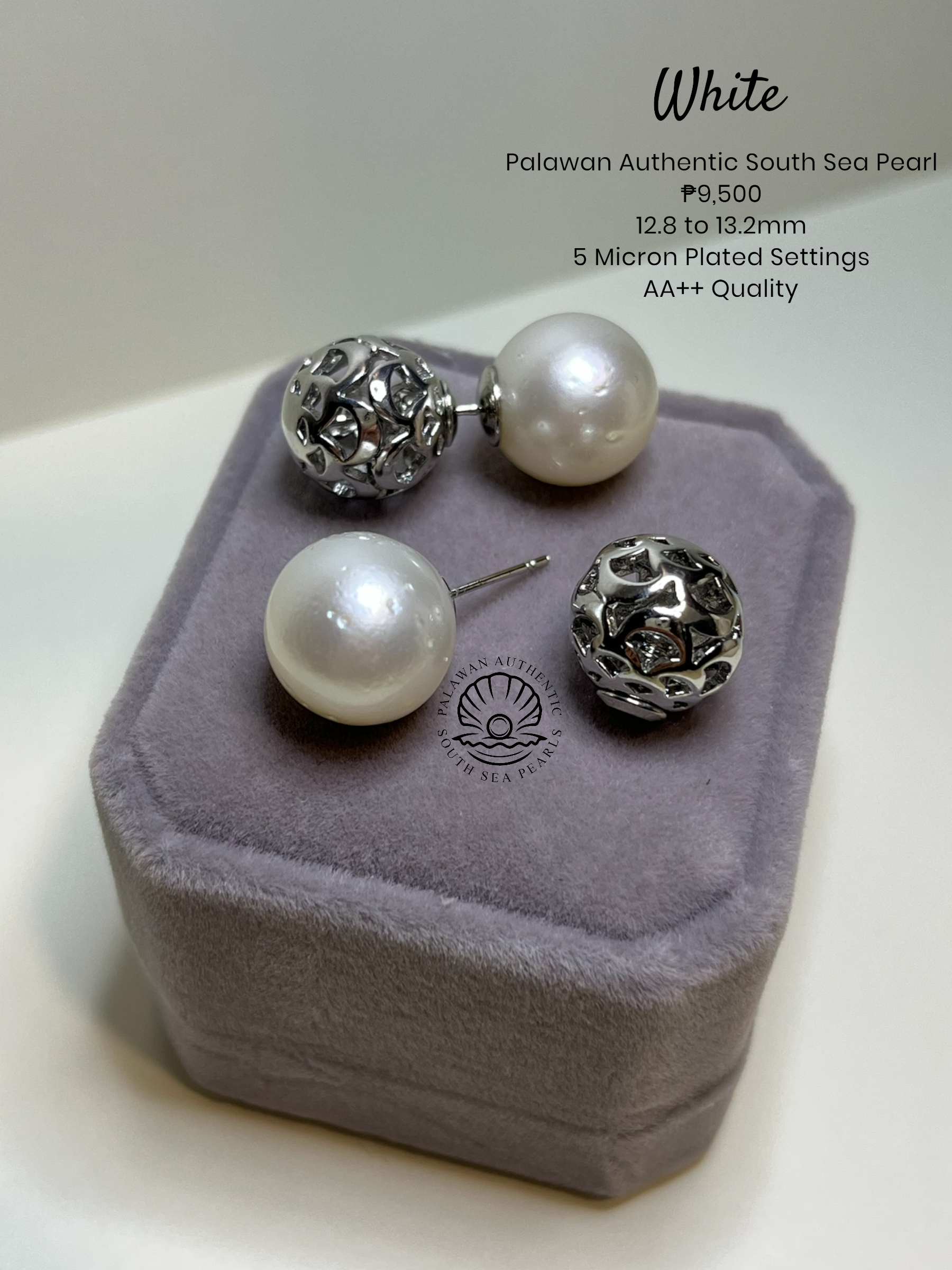 12.8 to 13.2mm Palawan Authentic White South Sea Pearl Special Design in 5 Micron Plated Settings