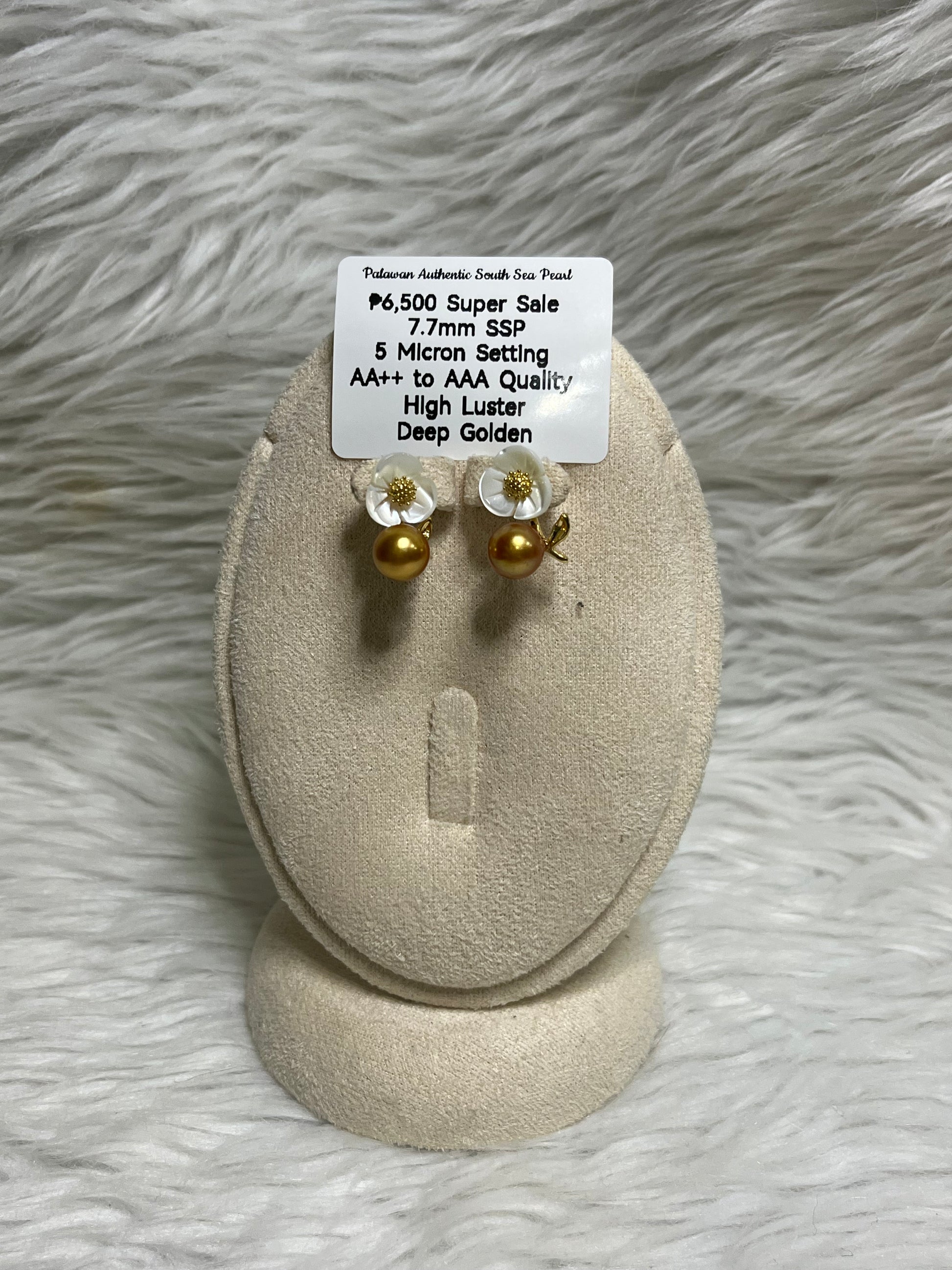 New Arrival! 7.7mm Authentic Deep Golden Color South Sea Pearl Earring in 5 Micron Setting