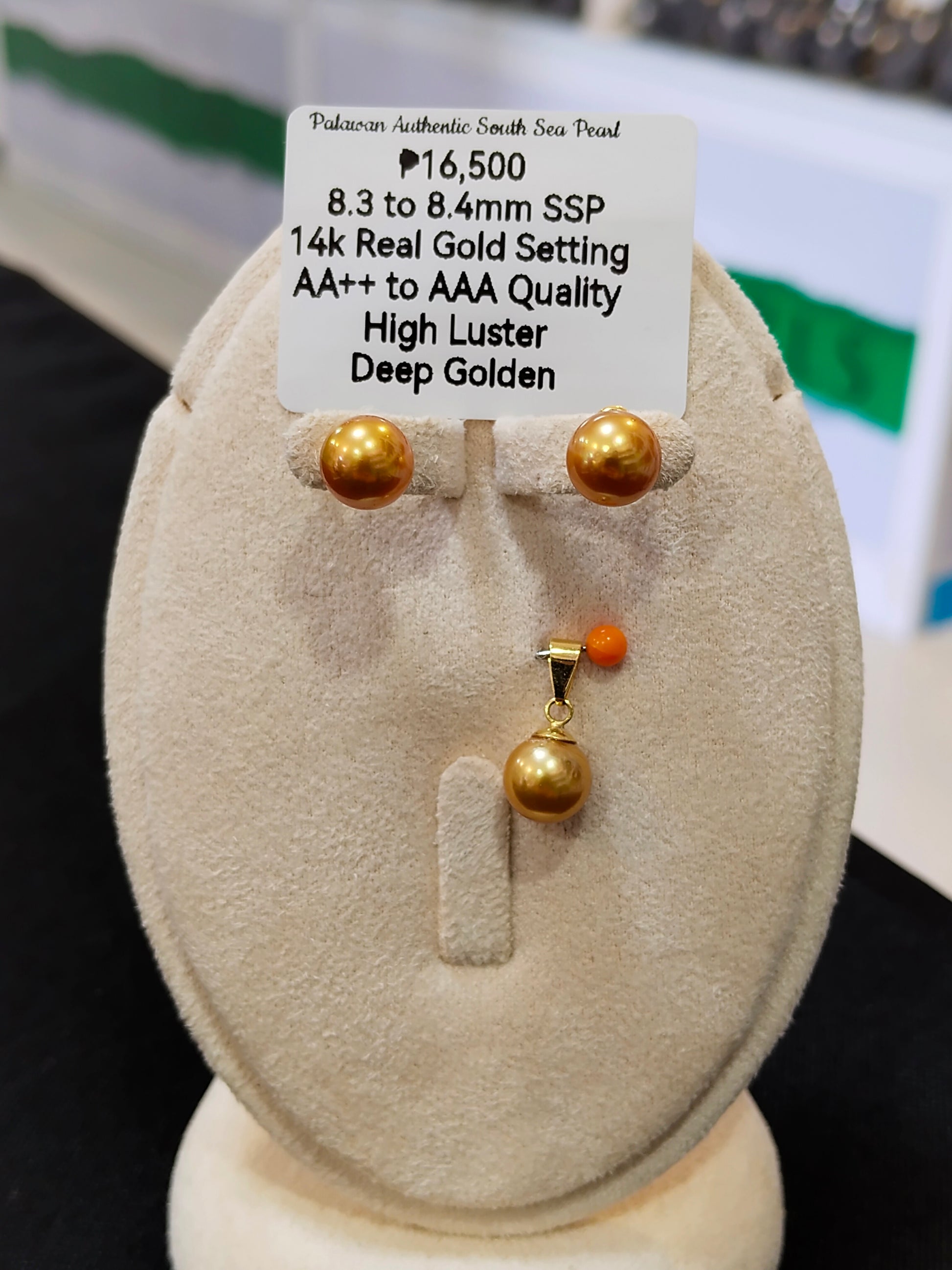 New Arrival! 8.3mm to 8.4mm Authentic Deep Golden Color South Sea Pearl Sets in 14k Real Gold Settings